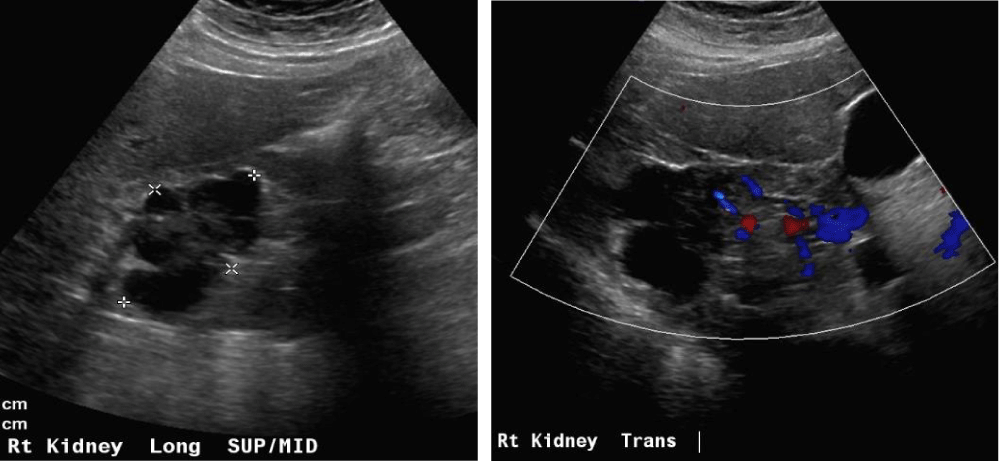 Figure 10a,b: Right cystic mass now with solid components concerning renal neoplasm with increased vascularity.