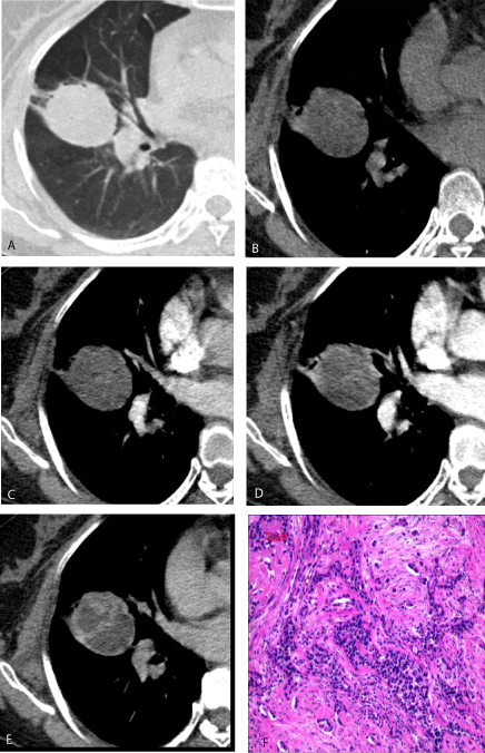 Other differential diagnosis: (1) Solitary Fibrous Tumor (SFT) have the basic features of benign tumors, Such as round solitary masses with smooth edges. Mixed different proportions of fusiform tumor cells and collagen components histologically adding necrosis, cystoid and mucoid degeneration diffuse distribution, so that enhancement of SFT in arterial phase is not obvious but obvious in the venous phase, which is the characteristic of progressive enhancement. (2) Inflammatory myofibroblastoma of lung: This tumor density was not uniform, so its liquefaction, necrosis, obviously enhancement are common imaging findings.