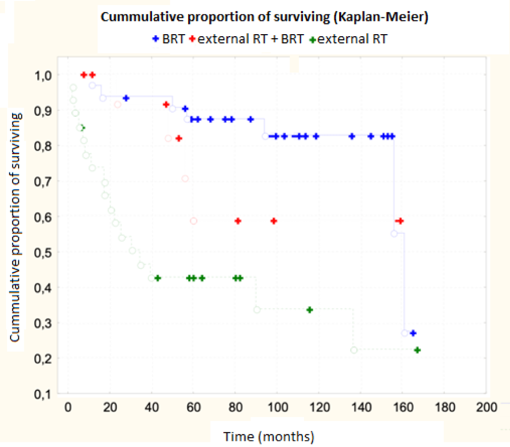 The age of patients, the size of their own primary tumor and the method of therapy used had a statistically significant effect on survival - the importance of brachytherapy was especially irreplaceable. We have shown some trend in some other factors, such as tumor grading, disease stage or dose rate. The application of the BRT was confirmed to be irreplaceable.