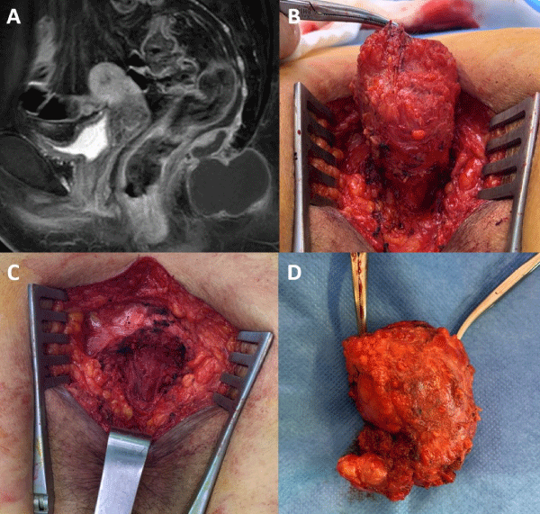 Figure 1: A: T1 Sagittal pelvis MRI image; B: Caudal view of surgical field. Elevator muscle in the background; C: Surgical field after tumor and coccyx resection ; D: Surgical specimen. It can be seen how the tumor involved the coccyx.