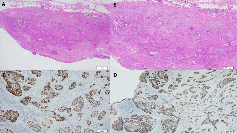 Figure 2: A: Squamous epithelium with high grade intraepithelial dysplasia and solid tumor nests infiltrating the thickness of the cyst wall (Hematoxylin-eosin); B: Higher magnification, these tumor nests infiltrated the cyst wall without reaching the fat (HE); C: The tumor cells were positive for p63; D: The tumor cells were positive for 5-6 Cytokeratins.
