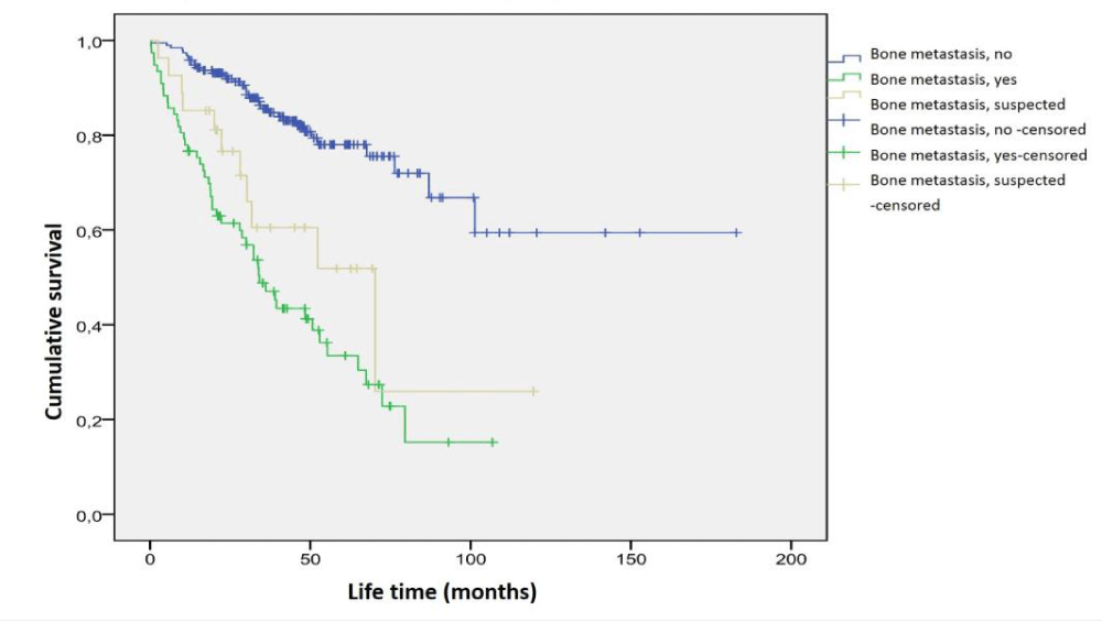 According to the presence of bone metastases in bone scintigraphy, the average life expectancy after diagnosis was determined in 172 patients without metastasis at 45.8 ± 28.0 months (range 5.2 - 182.9 months), in 70 patients with metastasis at 31.8 ± 24.0 months (range 0.3 - 106.8 months) and in 23 patients with suspected metastasis 38.1 ± 26.3 months (range 2.5 - 119.6 months) (p = 0.0001). A very significant difference was found between patients with and without bone metastasis (p = 0.0001). There was no statistically significant difference between the group without bone metastasis and the group with suspicious metastasis (p = 0.151) and between the group with bone metastasis and the group with suspicious metastasis (p = 0.297).