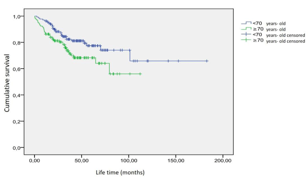 The survival times of the patients included in the study were calculated in months. To investigate the effect of age on survival time, patients were classified as under 70 years of age, 70 years, and above.