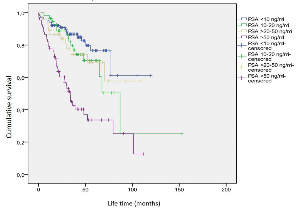Mean survival time was 40.9 ± 22.2 months (range 0.3 - 119.6 months) in 93 patients (38%) with PSA level < 10 ng/ml, 41.8 ± 24.7 months in 48 patients (20%) with PSA level 10-20 ng/ml (range 11.8 - 152.8 months), 42.2 ± 26.6 months (range 2.5 - 109 months) in 40 patients (16%) with PSA level > 20 - 50 ng/ml, and 31.3 ± 24.1 months in 62 patients (26%) with PSA level > 50 ng/ml (range 0.4 - 112.1 months) and a statistically significant difference was found between these groups (p = 0.008). In paired comparisons, there were statistically significant differences between the group with PSA level < 10 ng/ml and the group with PSA level > 50 ng/ml (p = 0.002), between the group with a PSA level of 10-20 ng / ml and the group with a PSA level of > 50 ng/ml (p = 0.004), and between the group with PSA level > 20 - 50 and the group with PSA level > 50 ng/ml (p = 0.024).