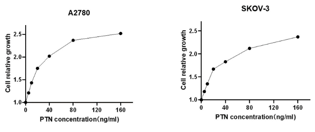 To verify whether exogenous PTN protein has an effect on cell growth, 2 × 104 A2780 and SKOV-3 cells were seeded in 24-well plates, and a gradient concentration of PTN protein was added the next day, and cells were counted 48 h later, with the relative number of cells as ordinate and PTN concentration as abscissa, as shown in Figure 3.4. According to the figure, the relative number of A2780 and SKOV-3 cells increased with the concentration of the PTN, showing a concentration-dependent growth, indicating that the exogenous PTN protein promoted the growth of A2780 and SKOV-3 cells (Figure 1).
