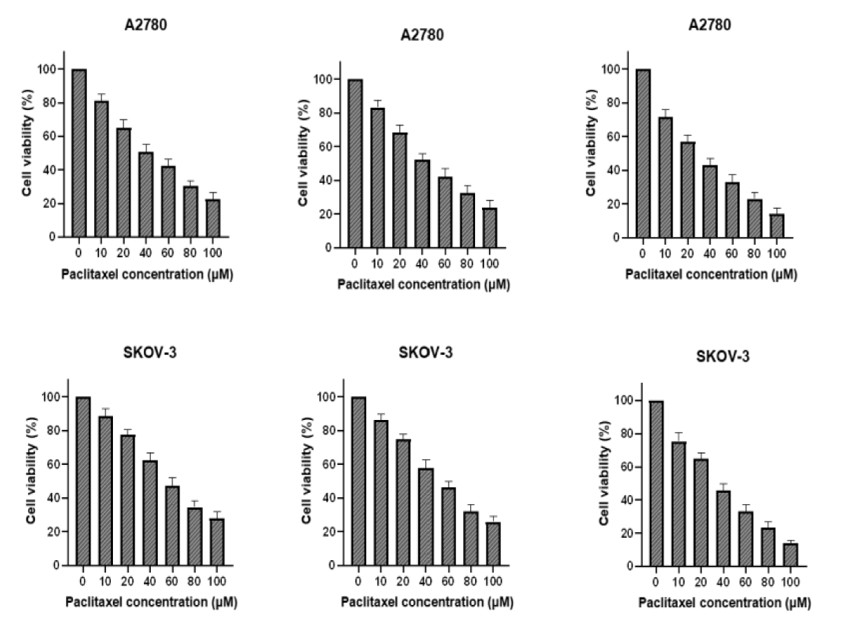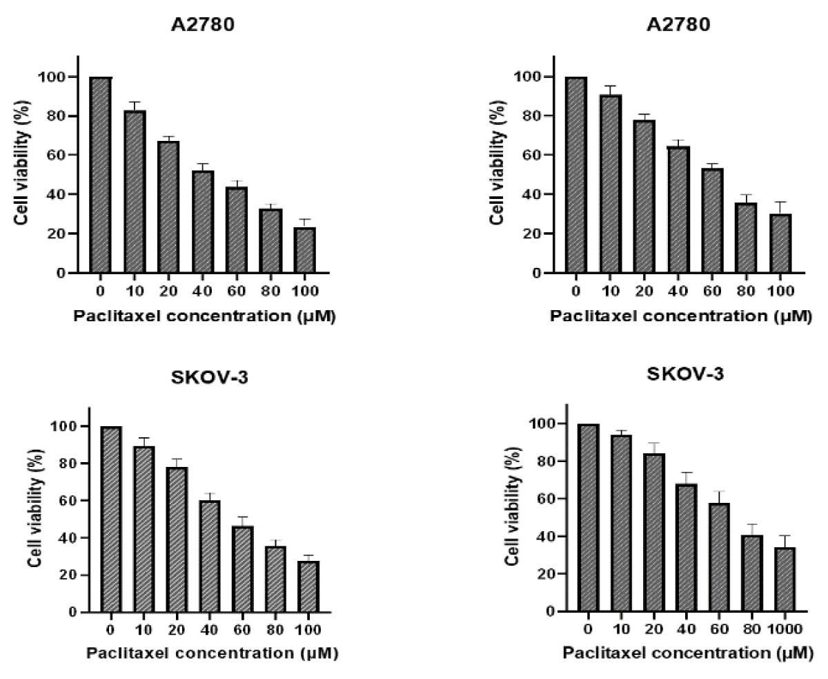 Figure 2: A and C were paclitaxel; B and D were paclitaxel and PTN.As can be seen from the figure, the higher survival rate of the cells in the PTN group at the same drug concentration than that without the PTN group indicates that PTN can attenuate the killing effect of paclitaxel on A2780 and SKOV-3 cells, and reduce the sensitivity of A2780 and SKOV-3 cells to paclitaxel. The IC50 values for A2780 and SKOV-3 cells were 25.32 M and 29.73uM, respectively.