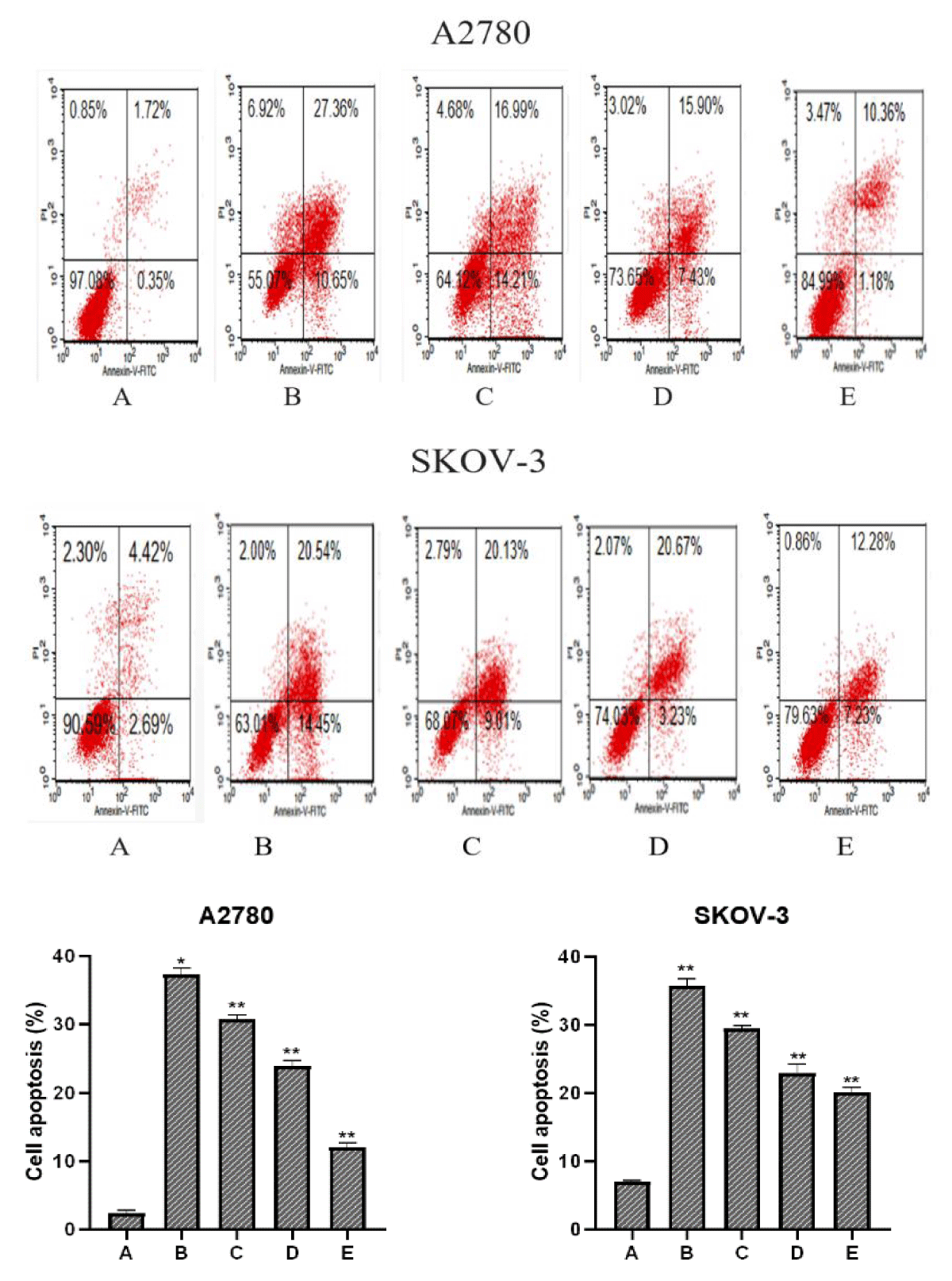 Figure 3: A, B, C, D and E indicate the Control group, paclitaxel + PTN (0 ng/ml) group, paclitaxel + PTN (20 ng/ml) group, paclitaxel + PTN (50 ng/ml) group, and paclitaxel + PTN (100 ng/ml) group, respectively. In comparison with the Control group, *p (0.05, **p ≤ 0.01). The early and late total apoptosis rates of two cell lines control group, paclitaxel + PTN (0ng/ml) group, paclitaxel + PTN (20 ng/ml) group, paclitaxel + PTN (50 ng/ml) group, paclitaxel + PTN (100 ng/ml) group were: A2780: 2.07%, 38.01%, 31.20%, 23.33%, 19.51%; SKOV-3: 4.35%, 34.96%, 29.14%, 23.90%, 14.56%, It can be seen from the figure that with the increase in the concentration of PTN, the rate of apoptosis decreases. The concentration of PTN and the rate of apoptosis show a concentration dependence and the results are statistically significant.