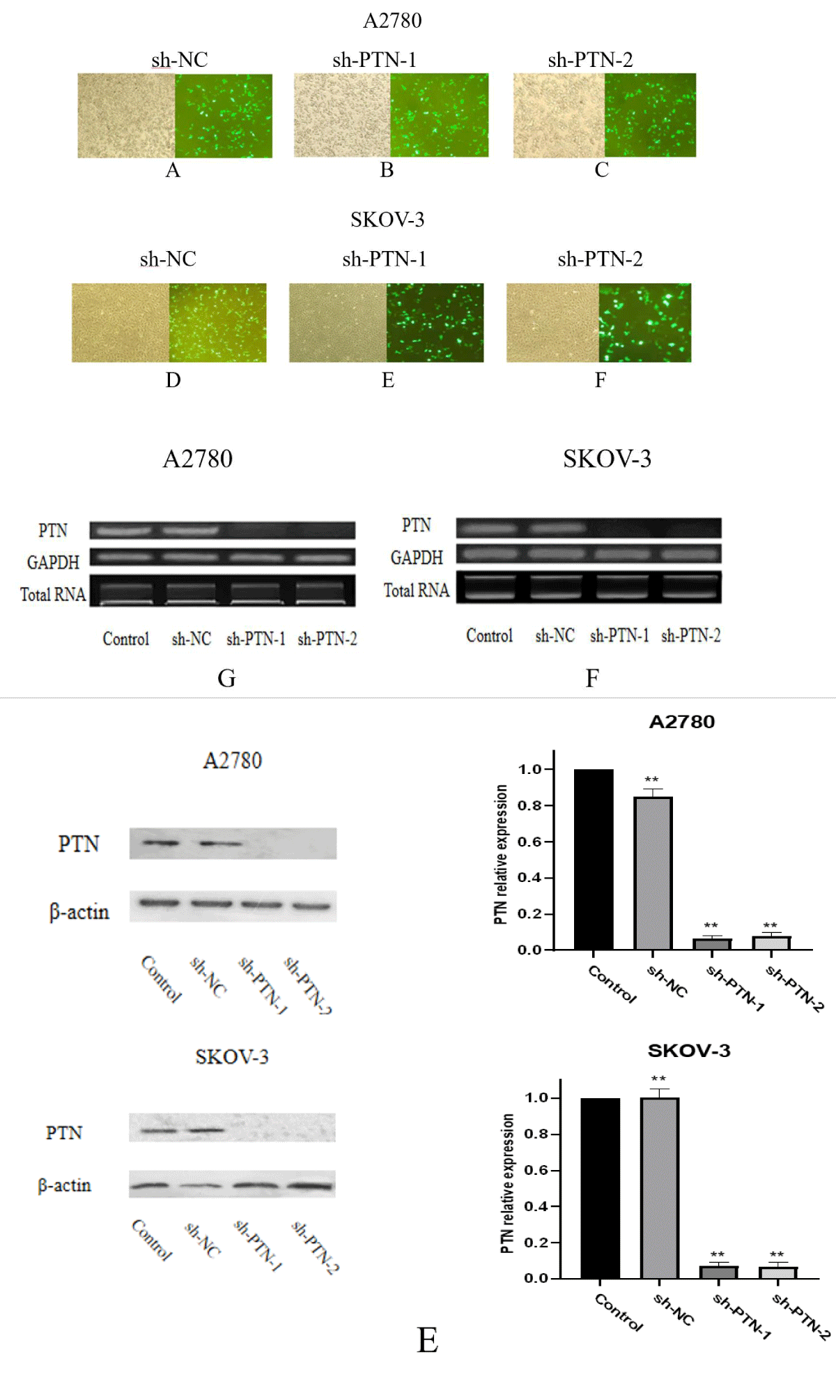 Figure 4: Number of A-F shows the transfection observed in the fluorescent inverted microscope. a number of G, F shows the mRNA expression observed by PCR. E shows the amount of PTN expression after adding interference plasmid in SKOV-3 and A2780.