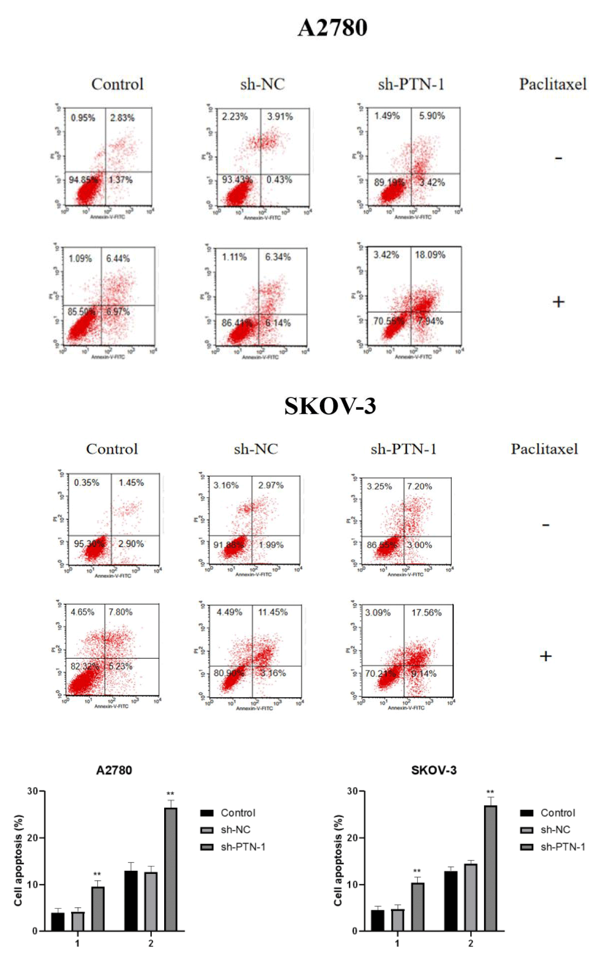 It can be concluded from the figure that there is no obvious difference in the total apoptosis rate between the sh-NC group and the control group, but the total apoptosis rate of the sh-PTN-1 group is significantly higher than that of the sh-NC group and the control group, which indicates that A2780 and SKOV-3 cells with silenced PTN expression are more sensitive to paclitaxel.