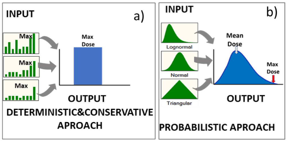 Figure 1: Schematic illustration of “old” conservative and “new” probabilistic approach to assess exposure levels of the public and in the environment.
