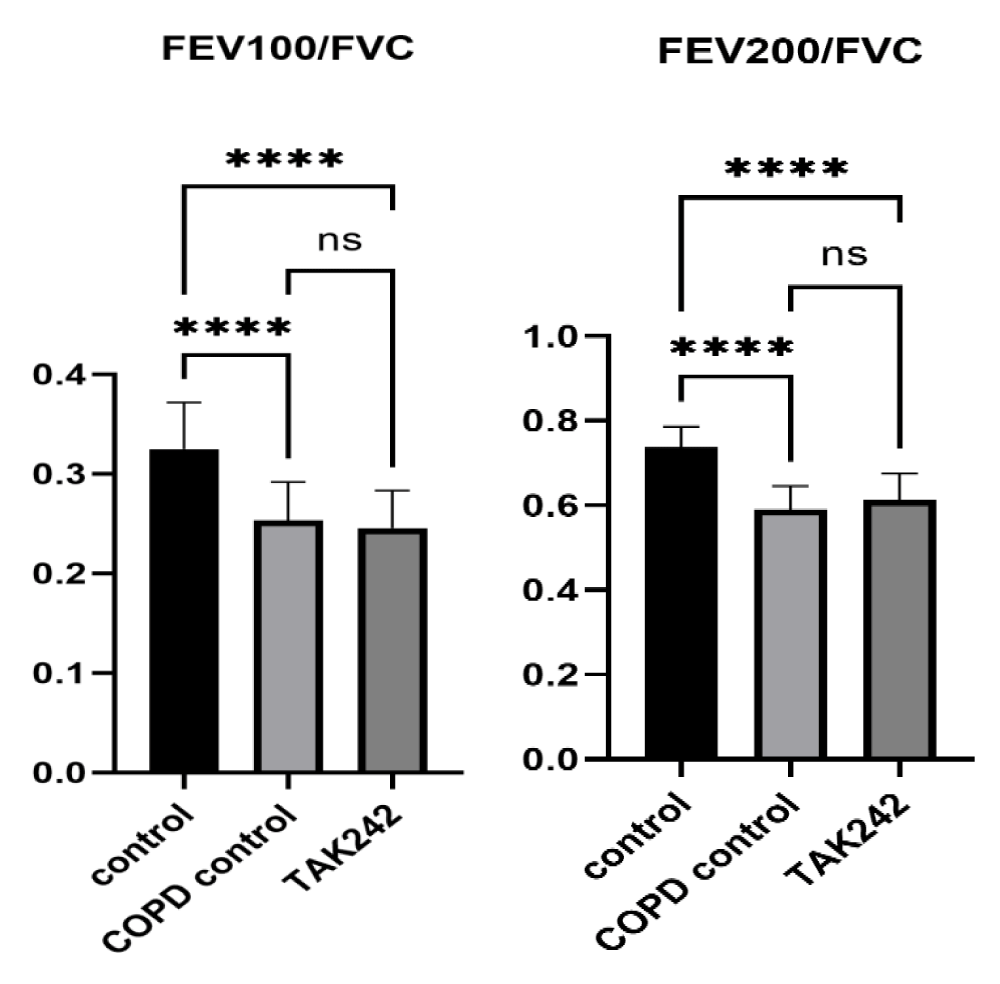 In order to verify the effect of COPD on the lung function of rats, we tested FEV100/FVC and FEV200/FVC parameters, and the results showed that there was a significant difference in FEV100/FVC and FEV200/FVC between rats in the control group and rats in the COPD group (p < 0.05), but there was no difference in the improvement of lung function of rats in the TAK242 group (p > 0.05) (Figure 1).