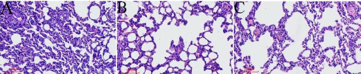 Figure 2: The general condition of the rats and histopathological changes in the lungs (A). HE staining of lung tissue in the control group. (B) HE staining of lung tissue of the COPD group. (C) HE staining of lung tissue in the TAK242 group.