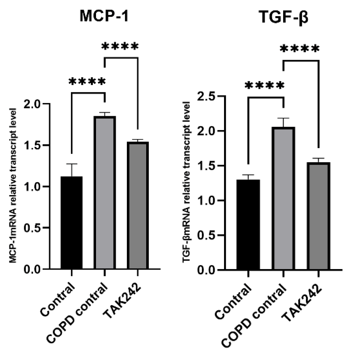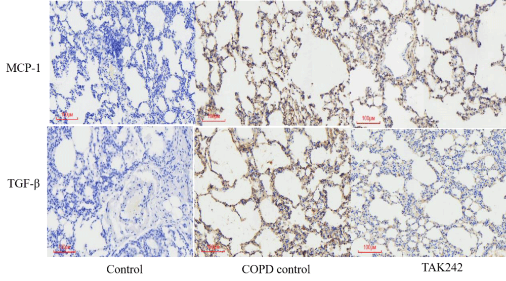 Results: Compared with the normal group, rats in the COPD control group showed signs and symptoms of COPD, decreased lung function, and increased expression of MCP-1 and TGF-β. The TAK242 group showed decreased expression of MCP-1 and TGF-β compared to the COPD control group.