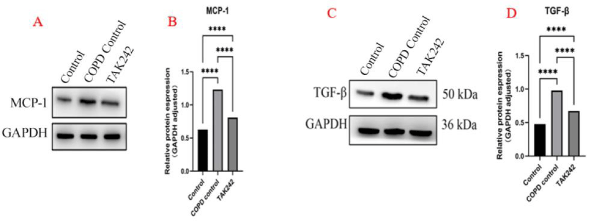 Objective: To investigate the mechanism of MCP-1 and TGF-β regulation by TAK242 in COPD rats.