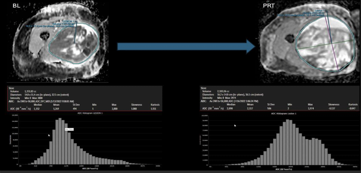 Figure 1: Case of pseudo-progression in a good-responder case: At the left panels, BL: Baseline/pre-treatment UPS ADC map, displaying central necrosis, a peripheral solid restricting tumor, and a left-sided intensity histogram. At the right panels and after completing 6 months of systemic therapy and radiation therapy (PRT: Post-Radiation Therapy), the tumor demonstrates a significant increase in volume (pseudo-progression), reduction in the solid diffusion restricting tumor, increase in mean ADC (from 1.2 to 2.1 x 10-3/mm2, reduction in skewness (from 1.0 to - 0.14) and an overall right-sided displaced histogram.