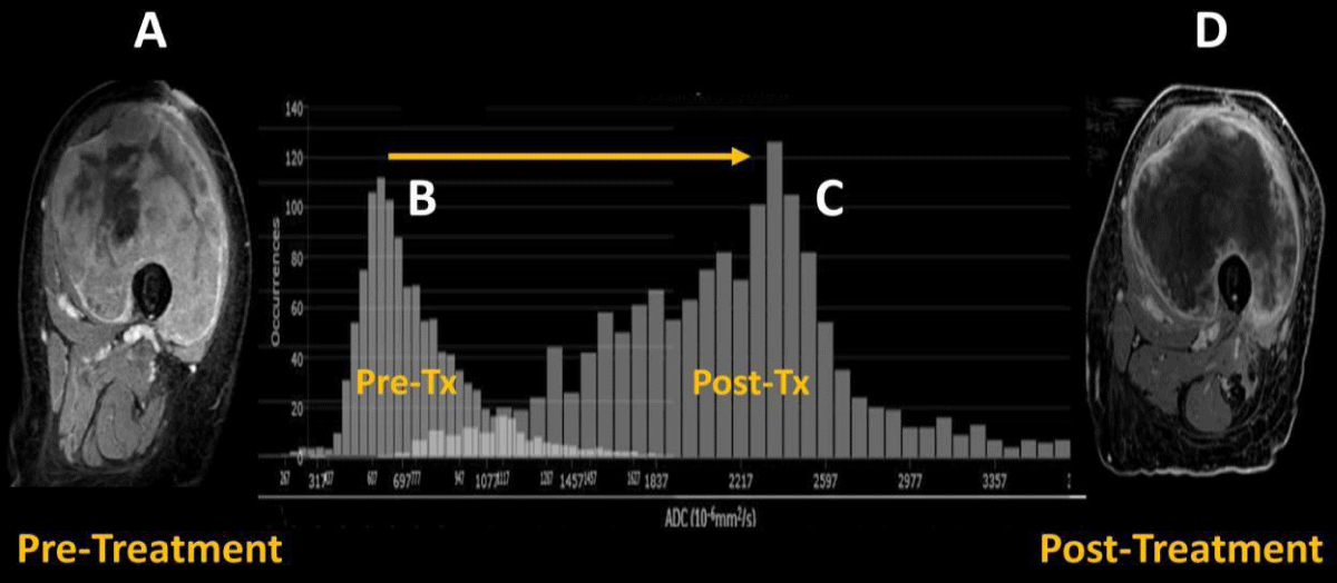 Figure 2: Pre-therapeutic contrast-enhanced MRI of UPS of the left thigh (A) with predominant solid internal enhancement and corresponding left-sided ADC histogram (B) with positive skewness. Post-therapeutic contrast-enhanced MRI of the same lesion (D) demonstrating highly diminished solid enhancement and corresponding right-sided ADC histogram (C) with negative skewness. The figure was modified with permission from the authors, Valenzuela, R.F. et al. [2].