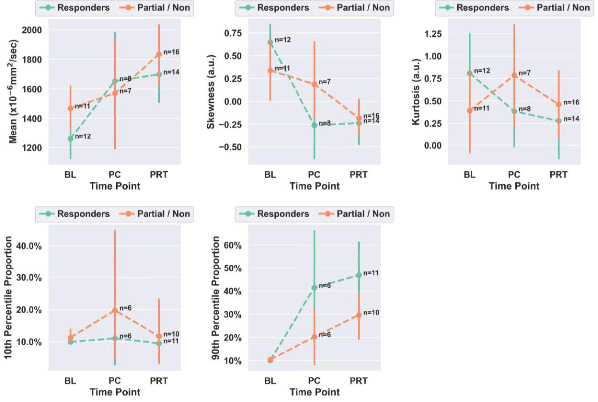 Figure 3: Scatter plots of ADC mean, skewness, kurtosis, and 10th and 90th percentile proportions at baseline (BL) vs. post-chemo (PC) vs. post-radiation therapy (PRT) in responders and partial/non-responders. Each point in the plot represents the group mean with a 95% confidence interval. a.u.: Arbitrary Units.