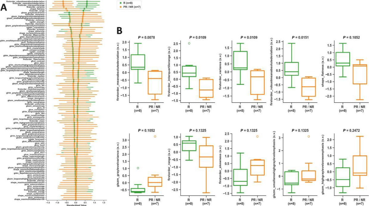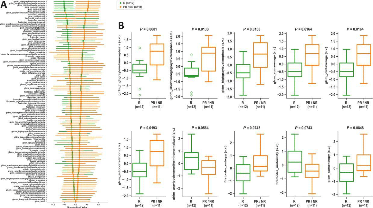 Figure 5: Post-chemotherapy time point analysis. ADC map radiomics scatter plot (A) showing means with 95% confidence intervals sorted from largest to smallest differences between R and PR/NR, and boxplots (B) of top 10 radiomic features comparing R vs. PR/NR. All P-values resulted from two-tailed non-parametric Wilcoxon rank-sum tests. s.v.: Standardized Value; R: Responders; PR/NR: Partial/Non-Responders.