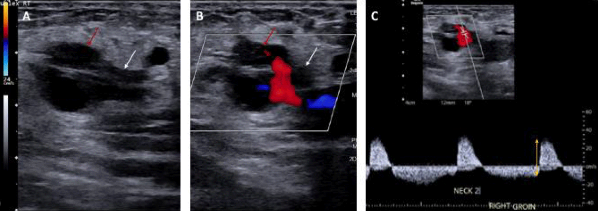 Figure 1: Two-dimensional ultrasound representation of the femoral artery pseudoaneurysm in our 65-year-old patient. A) PSA sac (red arrow) and neck (white arrow) without color flow. B) PSA sac and neck with color flow showing inflow at the neck. C) Waveform showing bidirectional flow in the PSA (yellow double-sided arrow).