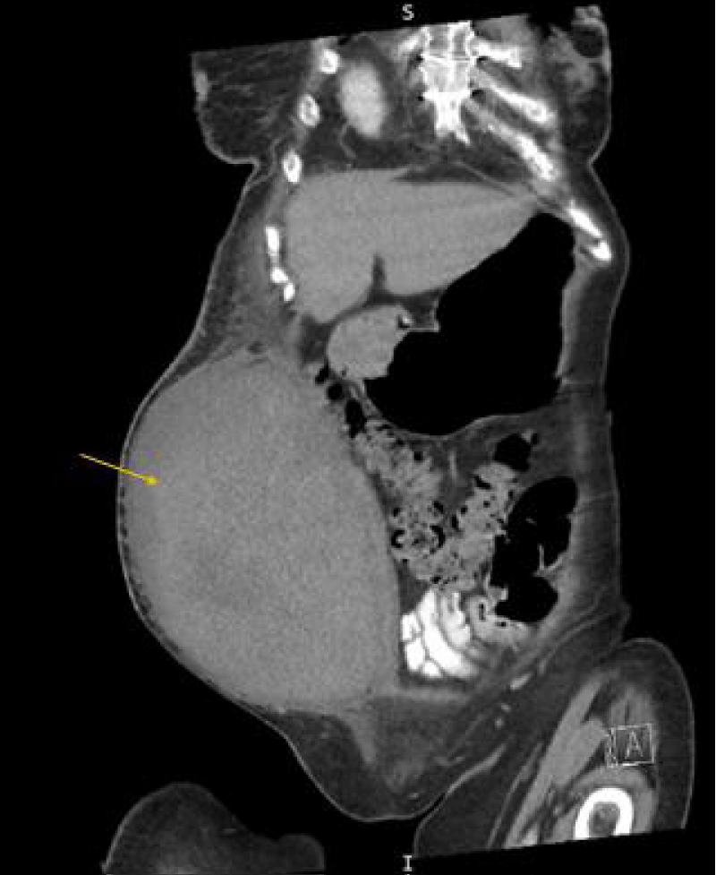 Figure 2: Computed tomography of the abdomen and pelvis with contrast showing coronal view of the rectus sheath hematoma measuring approximately 11.4 x 18.5 x 22.2 cm 19 days post-onset.